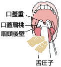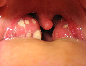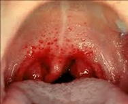 咽頭は著しく発赤し、口蓋扁桃(いわゆる扁桃腺)は腫脹して黄白色の滲出物が付着することが多くあります。