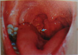 口蓋扁桃の発赤・腫脹と白苔の付着 (H15年 第97回医師国家試験より )