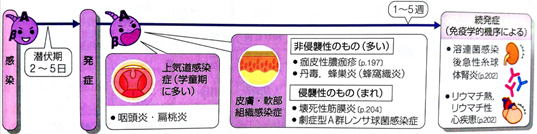 咽頭炎や白苔を伴う扁桃炎、真皮の丹毒、猩紅熱などが認められます。