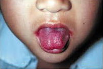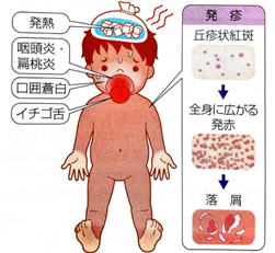 舌がイチゴのように赤くなるイチゴ舌という特徴的な症状がみられます。