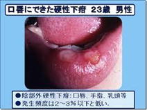 トレポネーマが侵入した部位(陰部、口唇部、口腔内)に塊(無痛性の硬結である硬性下疳)を生じます。