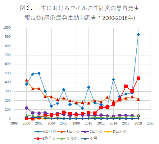 A型肝炎については、最近では2018年の急激な増加が目立ちます。