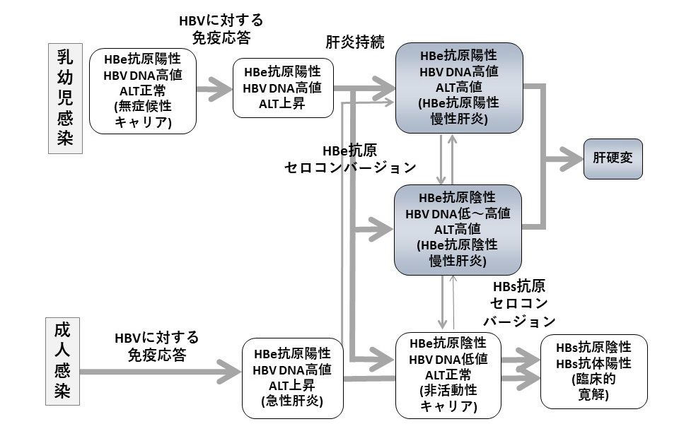 生後数年〜数十年間は肝炎の発症はなく、感染したHBVは排除されずに体内で共存しています。、