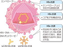 表面を被うエンベロープ蛋白がHBs抗原、その内側のコア蛋白がHBc抗原と呼ばれています。