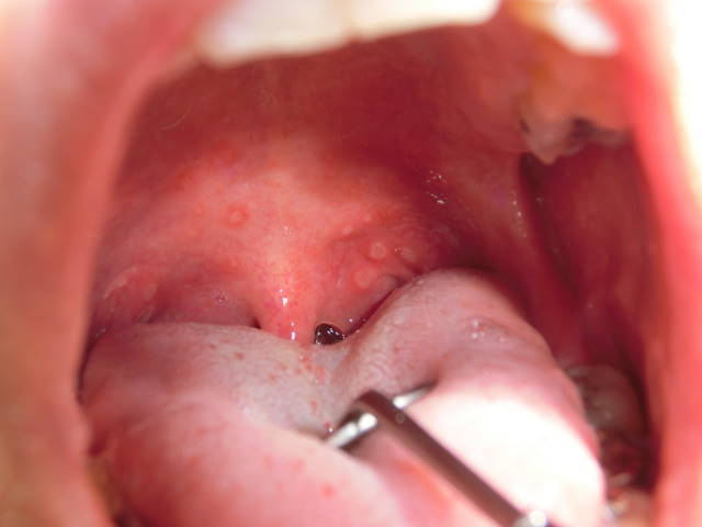 その後、咽頭粘膜が赤くなり、口腔に1-5mmの小水疱が数個出現します。