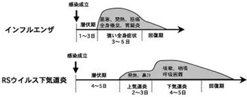 RSVの初感染は常に顕性で、軽症の感冒様症状から重症の細気管支炎や肺炎などの下気道疾患に至るまで、
