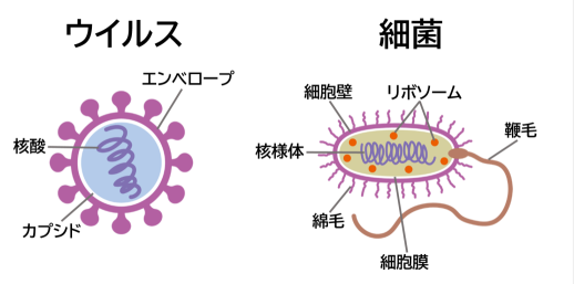 ウイルスは大きさや仕組みが細菌と異なるので抗菌薬(抗生剤、抗生物質)は効きません。