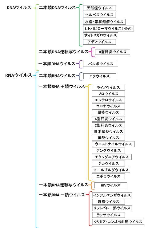 例:コロナウイルス、エンテロウイルス、風疹ウイルス、日本脳炎ウイルス、デング熱ウイルス、