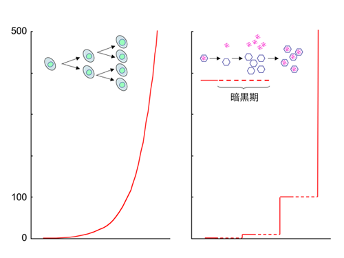 B他のほとんどの生物の細胞は2nで指数関数的に増殖するのに対し、ウイルスは一段階増殖をします。