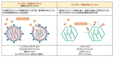 エンベロープはその大部分が脂質から成るためエタノールや有機溶媒、石けんなどで処理すると容易に破壊する