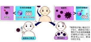 感染成立には、 病原性(ヴィルレンス)+病原体数+宿主の生体防御機構(免疫) のバランスが大きく関与します。
