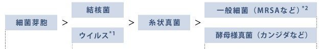 耐性: 強 芽胞形成菌---結核菌・ウイルス---糸状真菌---一般細菌・酵母様真菌 弱