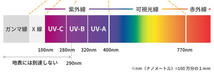 紫外線は波長が10〜400 nm、即ち可視光線より短く、軟X線より長い不可視光線の電磁波です。