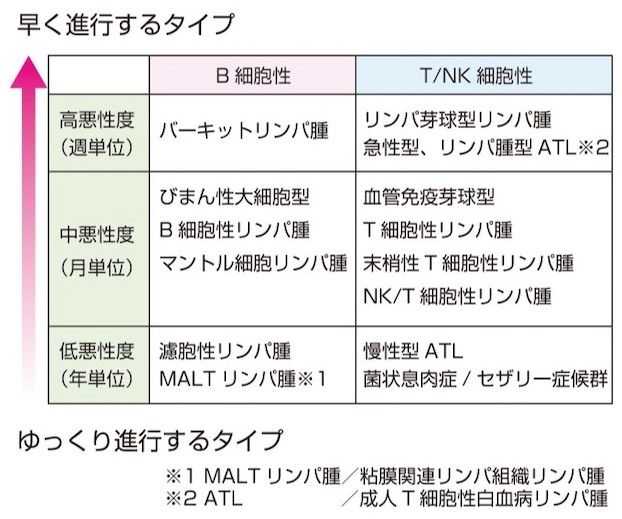 また、腫瘍細胞の性格から、T細胞性、B細胞性、NK細胞性に分類されます。