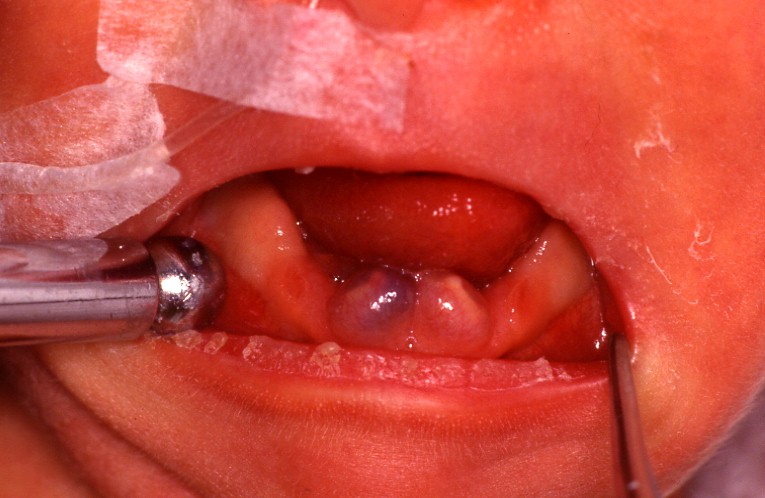 歯が萌出中に当該歯槽堤粘膜に限局性の膨隆としてみられる嚢胞がまれに生ずることがある。