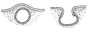 一般に嚢胞は固有の壁をもっていて内面が上皮で裏装され、そのなかに液体(流動体)または
