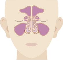 その外側に左右4つずつ空洞があり、これを副鼻腔(ふくびくう)といいます。