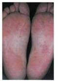 特に手掌、足底に小さい紅斑が多発し、皮がめくれた場合は特徴的です。