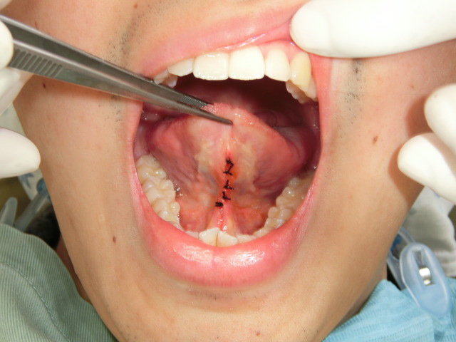 一般的には舌小帯に横切開を加え、舌小帯を切離して菱形となった切開創の舌下面と口腔底の部分を縫合する(舌小帯切断伸展術)ことによって、舌運動制限を解除します。