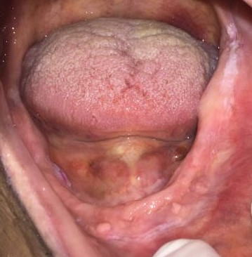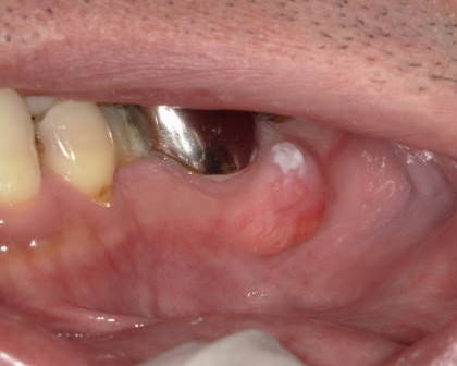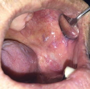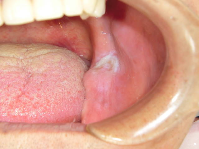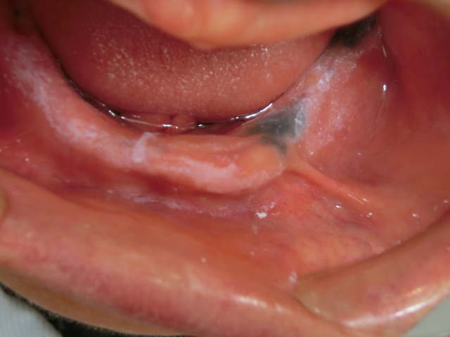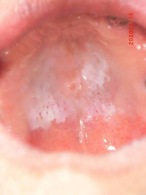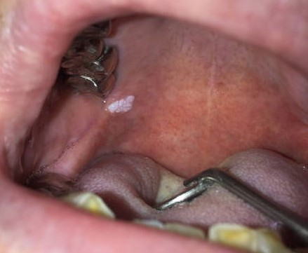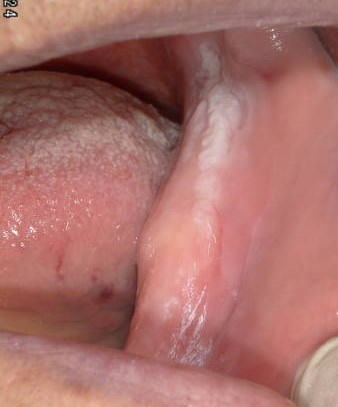 症例1:一見カンジダ症にも見えますが、拭いても剥離できない白板症。