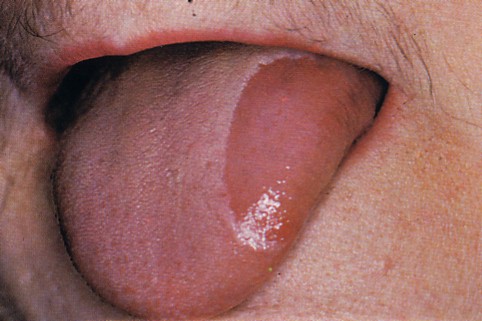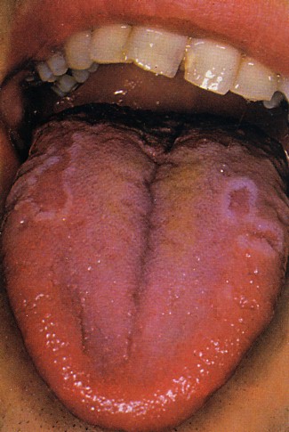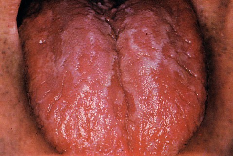 舌の表面に爪甲状の大きさ、形態の淡紅色斑が散在し、この部分では毛状乳頭が消失あるいは扁平化していて、なかには発赤した茸状乳頭が点在しています。