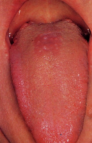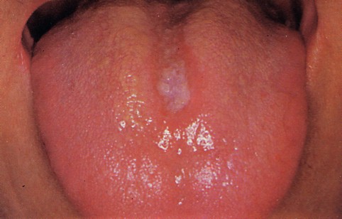 中年以後の男性に圧倒的に多く発現し、舌背正中後方の有郭乳頭直前に平坦または隆起を示す長い楕円形、または菱形の非炎症性赤色斑として認められる。
