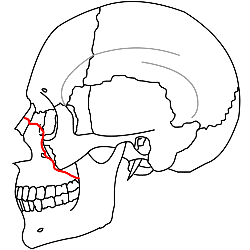 鼻骨を横断し、眼窩後壁を経て下眼窩裂、頬骨の前頭突起を通り後方へ向かい、上顎骨と蝶形骨の間を通過する