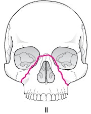 鼻骨−上顎骨前頭突起−涙骨−篩骨−眼窩底−上顎骨頬骨縫合部−翼口蓋窩−翼状突起に達する骨折です。