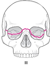 鼻腔底より上方レベルでの水平骨折で、Lefortの3型の中では最も頻度は少ない骨折です。