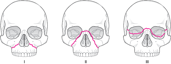 これら周辺骨を含めたLe Fort (ルフォー)I、II、III 型骨折と、矢状骨折に大別されます。