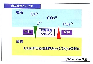 フッ素が萌出後の歯の表面に直接作用し、ハイドロキシアパタイトからフルオロ アパタイトを生成してエナメル質に