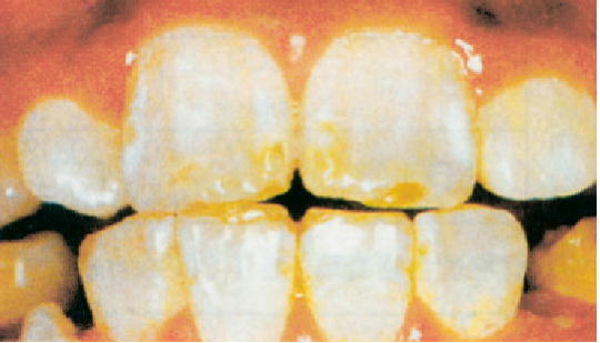 A長期間過剰にフッ素を摂取し続けた場合 生まれてから7歳くらいまで(永久歯の石灰化の時期)過剰に体内にフッ素を摂取し続けた場合 ↓ 永久歯に斑状歯というフッ素症が現れることがあります。