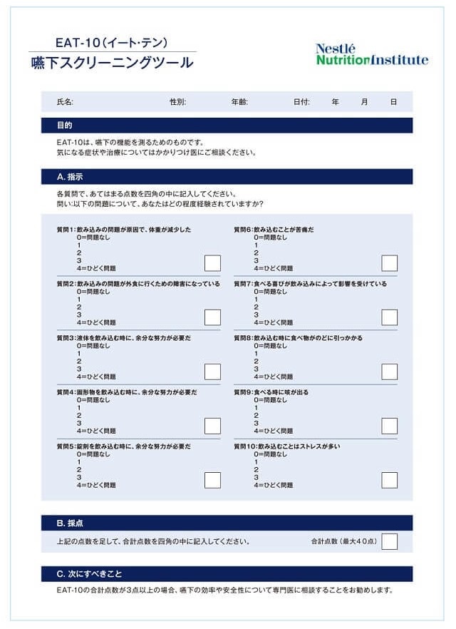 嚥下スクリーニング質問紙(The 10-item Eating Assessment Tool, EAT-10)を用いて評価する。