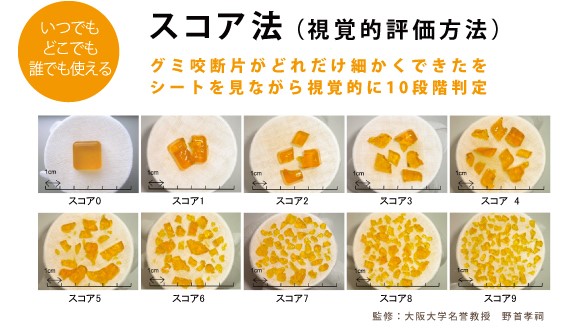 咀嚼能率スコア法は,グミゼリー(咀嚼能率検査用グミゼリー,UHA 味覚糖・アズワン)を 30 回咀嚼させる。