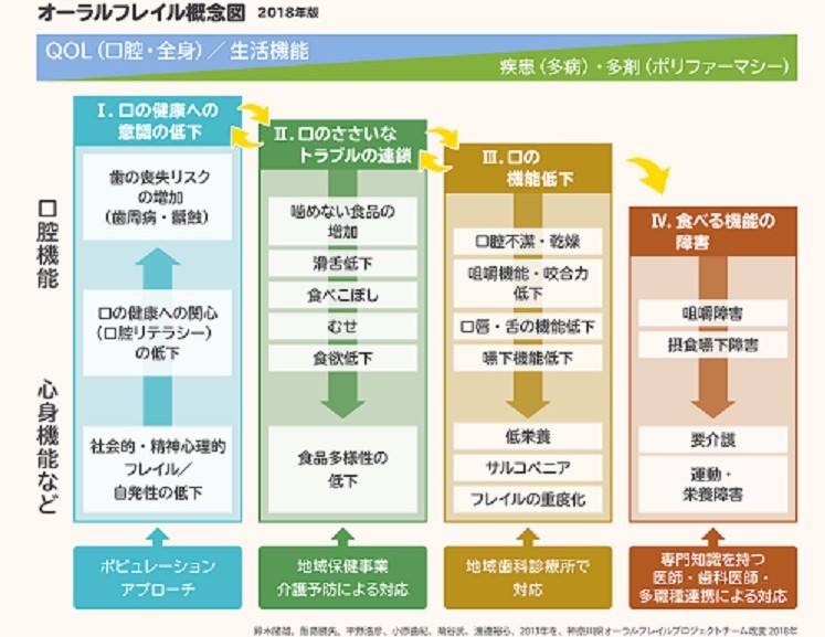 つまりオーラルフレイルを早期に発見し対応することは、フレイルリスク者の早期発見、対応に繋がるということになります。