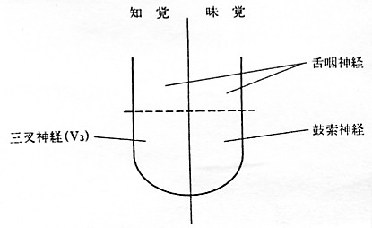 (2)知覚枝 舌の前方2/3からの味覚 ↓ 走行(舌神経、鼓索神経) ↓ 孤束核(延髄内)