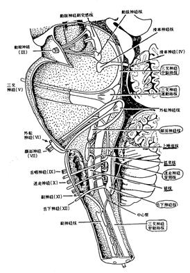 脳神経 第1脳神経 : 嗅神経 第2脳神経 : 視神経 第3脳神経 : 動眼神経 第4脳神経 : 滑車神経 第5脳神経 : 三叉神経(混合神経;運動、知覚) 第6脳神経 : 外転神経 第7脳神経 : 顔面神経(混合神経;運動、知覚、副交感枝) 第8脳神経 : 聴神経 第9脳神経 : 舌咽神経(混合神経;運動、知覚、副交感枝) 第10脳神経 : 迷走神経(混合神経;運動、知覚、副交感枝) 第11脳神経 : 副神経 第12脳神経 : 舌下神経(運動神経)