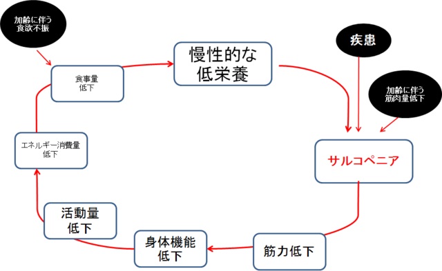 慢性的な低栄養の状態は、サルコペニアをさらに進行させ、筋力低下が進むという悪循環へ陥ります。