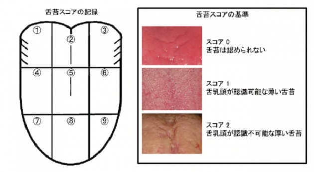 舌表面を 9 分割し,それぞれのエリアに対して舌苔の付着程度を 3 段階(スコア :0,1 , 2)で評価します。