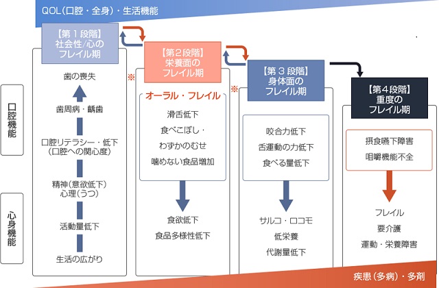 オーラルフレイルはフレイル概念図の第2段階、口腔機能低下症は第3段階に位置するとされています。