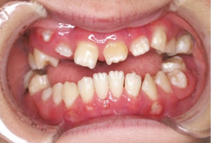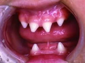 重度歯周炎(乳歯と永久歯の動揺と早期脱落,歯槽骨吸収,口臭)、永久歯の早期萌出
