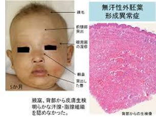 無汗症、疎な頭髪,低い鼻根、未発達な鼻翼、老人様顔貌、など。