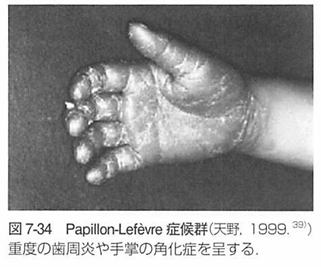 重度歯周炎と掌蹴角化症が特徴です。